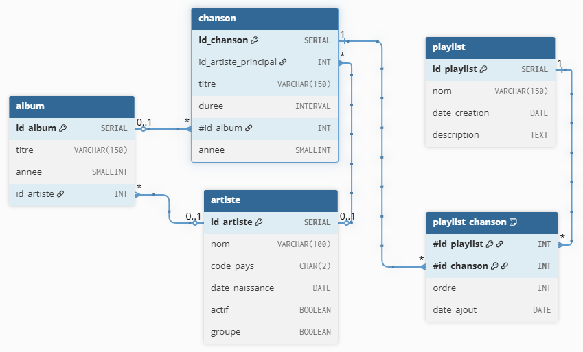 - artiste(id_artiste, nom, code_pays, date_naissance, actif)