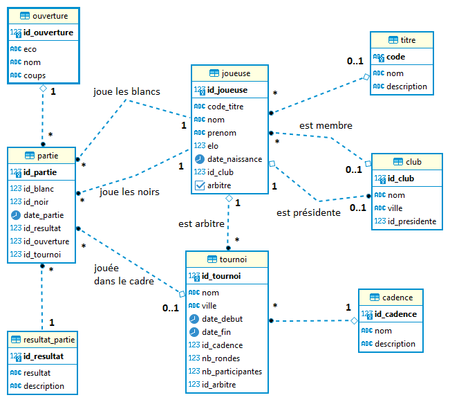 - joueuse(id_joueuse, code_titre, nom, prenom, elo, date_naissance, #id_club, arbitre)