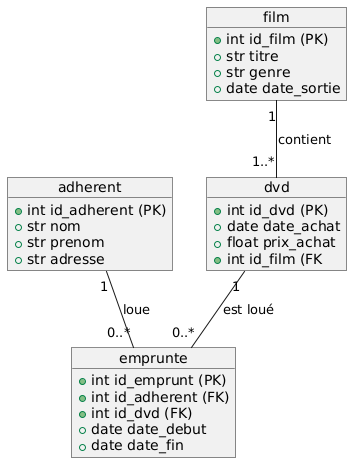 Un emprunt est caractérisé par un numéro d’emprunt, la date de début, la date de fin, le numéro d’adhérent et le numéro du dvd emprunté.