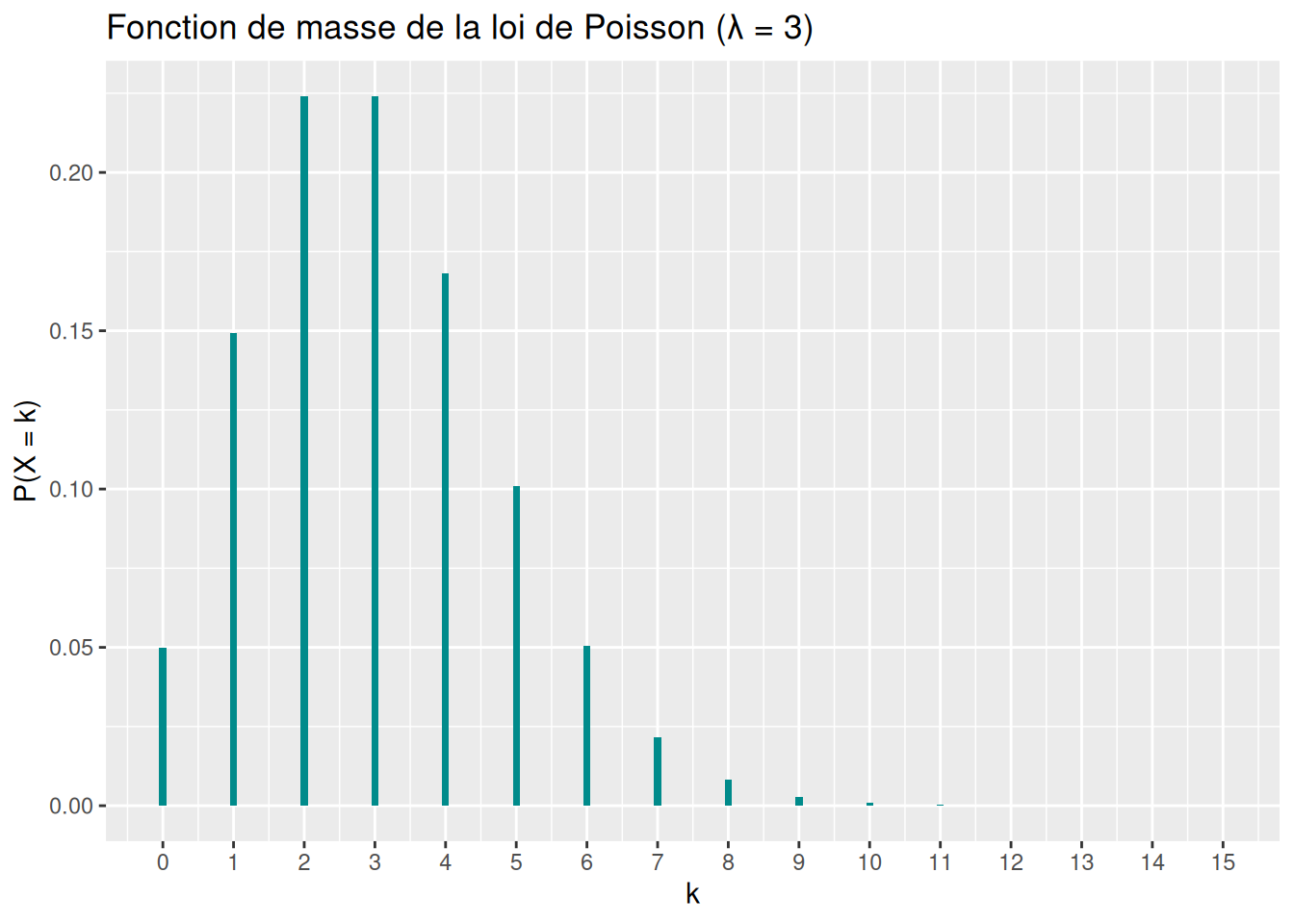 F_x <- ppois(x, lambda = lambda)Fonction de masse : \[\mathbb{P}(X=k)=\frac{\lambda^k}{k!}e^{-\lambda},\quad k\in\mathbb{N}\]
