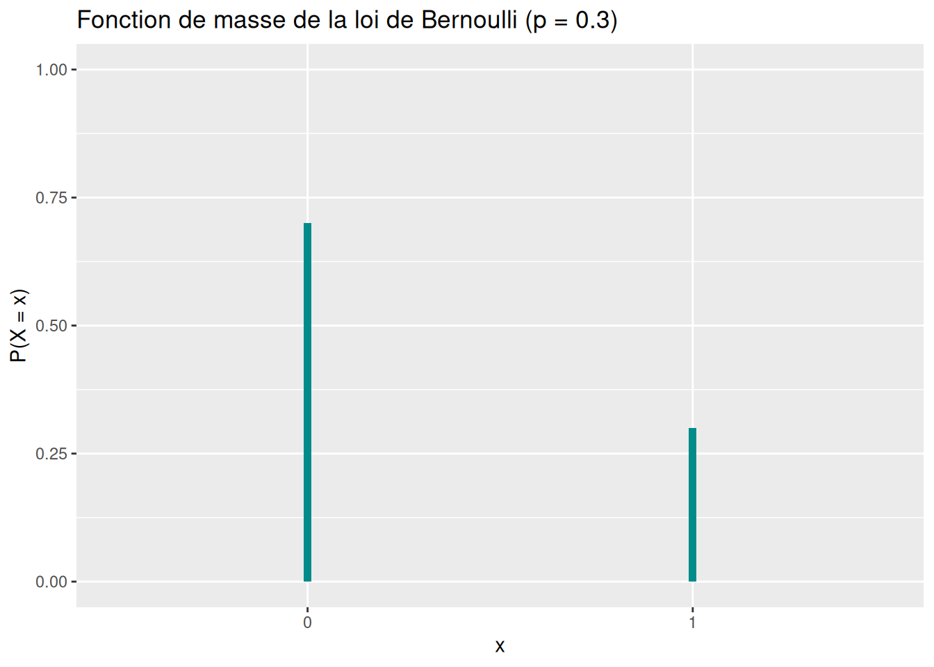 labs(title = "Fonction de masse de la loi de Bernoulli (p = 0.3)",