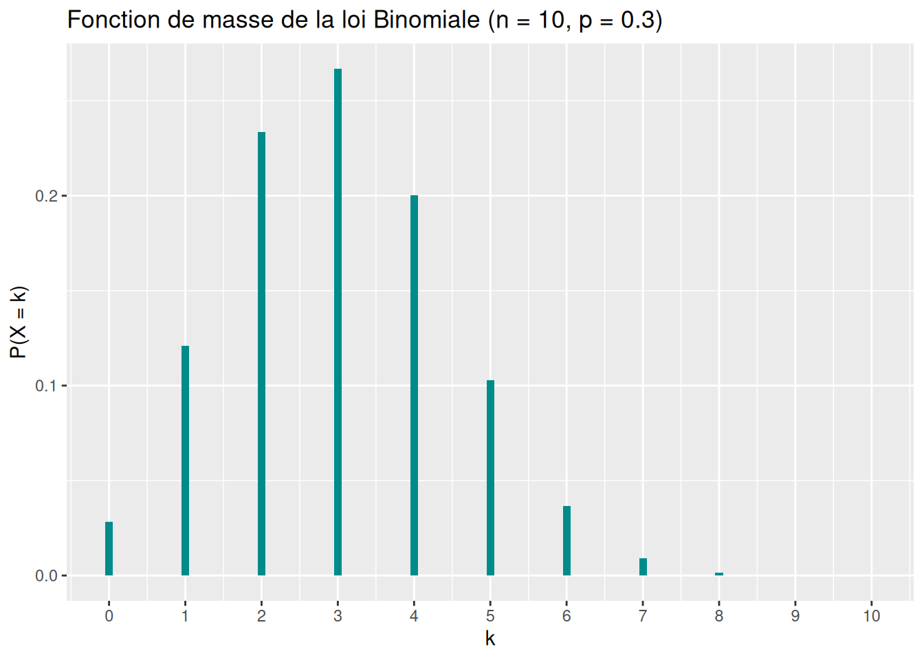 labs(title = "Fonction de masse de la loi Binomiale (n = 10, p = 0.3)",