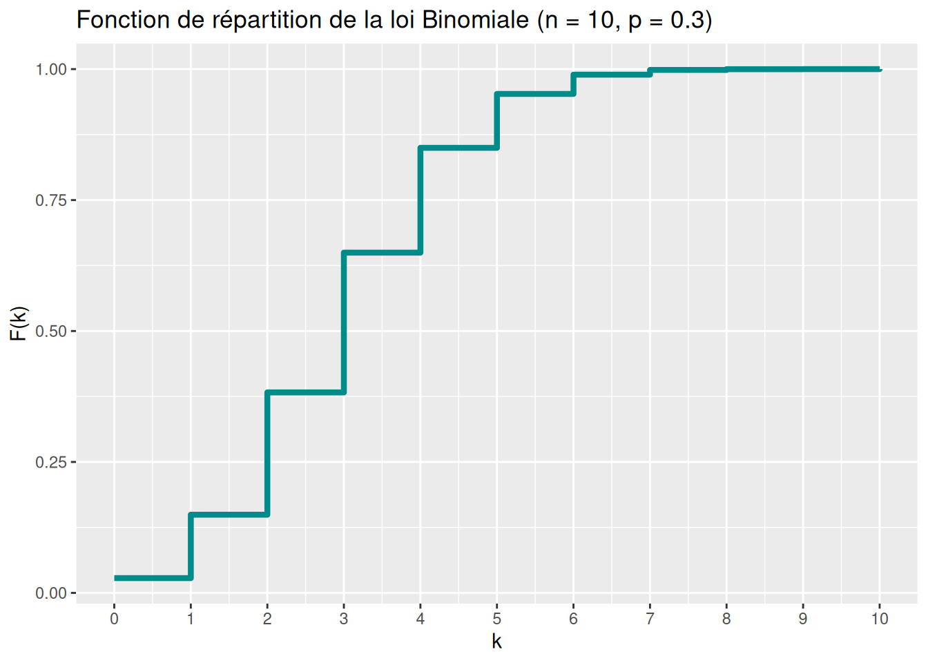 labs(title = "Fonction de répartition de la loi Binomiale (n = 10, p = 0.3)",